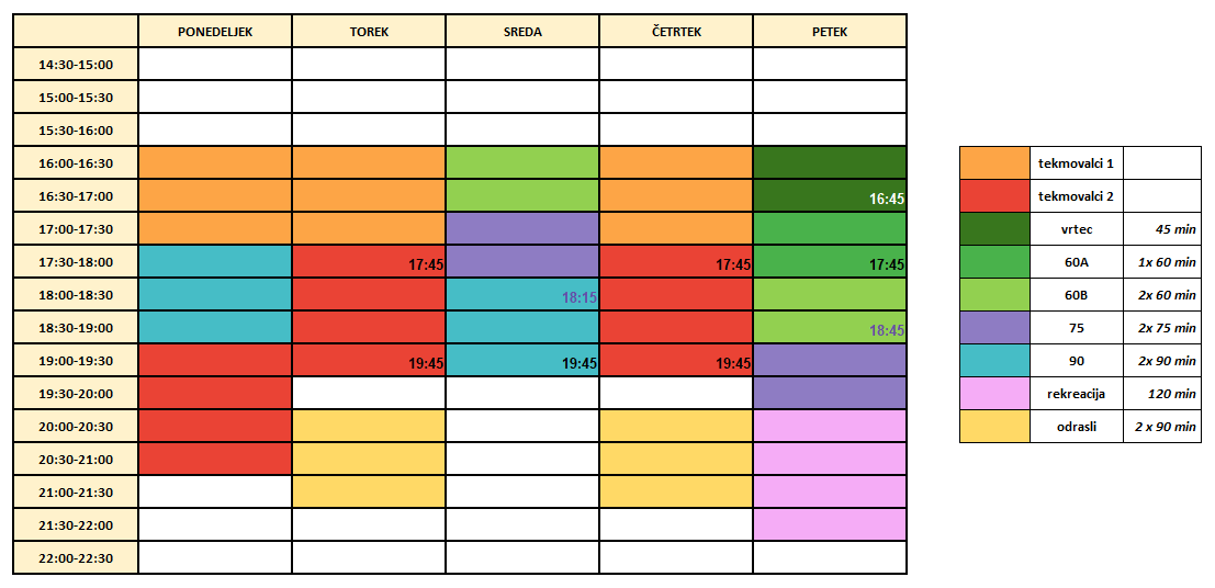 Urnik ostaja enak preko celega šolskega leta. Prehodi iz skupin niso možni razen pri skupinah tekmovalci 1 in 2 glede na prikazano zavzetost in dosežke.